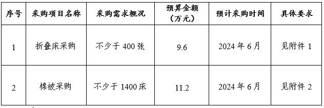 为便于供应商及时了解政府采购信息,根据《财政部关于开展政府采购意向公开工作的通知》(财库〔2020〕10号)等有关规定,现将采购折叠床和棉被相关事项公示如下: